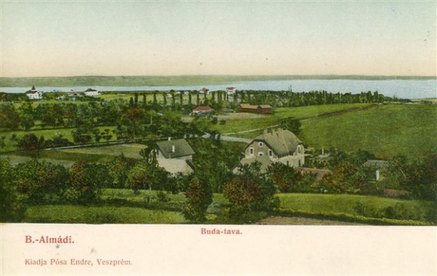 Az Öreghegyről 1902 körül készült képen Almádi mai központjának helye látszik. A "Buda-tava" elnevezés téves.