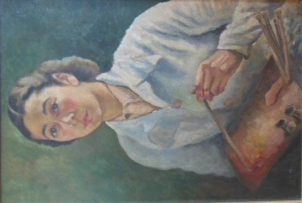 Önarckép. Festmény. Leírása: Fiatal nő portréja szemből. Haja koszorúba kötve, fehér köpenyt visel, bal kezében ecsetet, jobb kezében palettát tart. 1943. Anyag: farost, technika: olaj. Méret: 70cmx50cm. Keretezett.